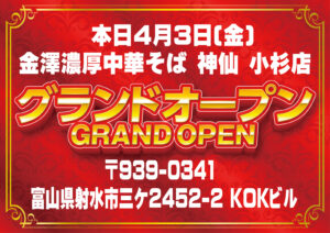 🎉【新規オープンのご案内】🎉 本日4月3日(金) 金澤濃厚中華そば 神仙 小杉店 オープン致しました🍜